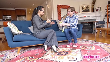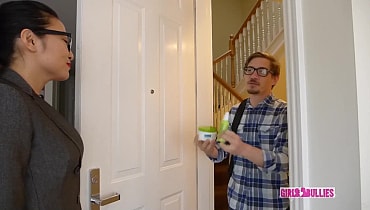 When a little twink shows up at her door raising funds for his college Kim Lee decides he might just be cute enough to have a little fun with. She invites him and easily intimidates him into doing a little strip dance for her. Once he is down to his undies she brings him back to her bedroom to see if might be good for something besides just ogling. NOPE! The awkward dork has no idea what he is doing and quickly makes a fool of himself. Kim is still having a little fun teasing him in her lingerie and making him feel as embarrassed as possible.