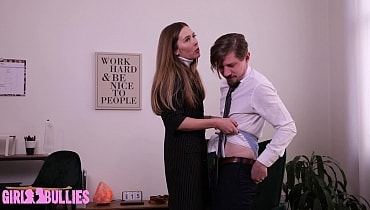 There are plenty of reasons to be nervous when starting a new job but it does not get much worse than realizing your new boss is your old bully. When Star recognizes her latest office temp as Sam, the nerd from school, she bluntly asks if he still wears tighty-whities. That question turns out to be the least embarrassing part of Sam's first day. Star soon has his underwear in a firm grip as she reminisces about the time she gave him a hanging wedgie off his locker so the whole school could walk by and laugh at him. Sam tries to assert his adulthood and dignity but Star just laughs in his face and yanks his undies harder. Star effortlessly controls Sam by the wedgie up his butt while keeping her other hand free for spanks and cock teasing. Star lets him know that his main job for the week will be helping her de-stress by serving as a wedgie toy.